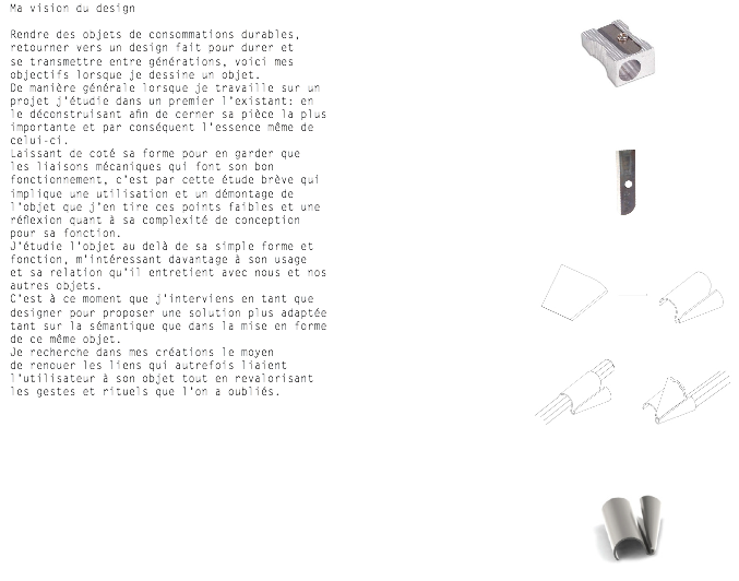 Rendre des objets de consommations durables, retourner vers un design fait pour durer et se transmettre entre générations, voici mes objectifs lorsque je dessine un objet.